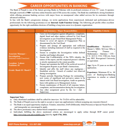 The Bank of Punjab (BOP), one of Pakistan’s fastest growing commercial banks with over 35+ years of excellence and a network of 900+ online branches and ATMs nationwide, is hiring an Associate Manager – Investigation in its Internal Audit Function Group at Lahore.