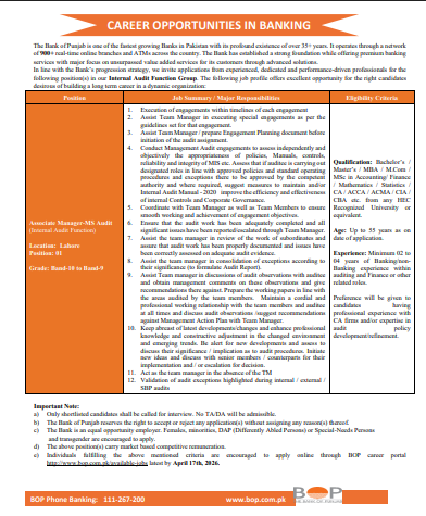 The Bank of Punjab (BOP), a leading commercial bank in Pakistan with over 35+ years of operational excellence and a network of 900+ branches nationwide, is hiring an Associate Manager – MS Audit for its Internal Audit Function Group in Lahore.