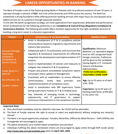 Apply online for Assistant Manager Technology Compliance Jobs 2026 at Bank of Punjab Lahore before April 13, 2026. The Bank of Punjab (BOP) is offering latest banking jobs in Pakistan in its Compliance & Control Group under Regulatory Compliance & Governance Division.