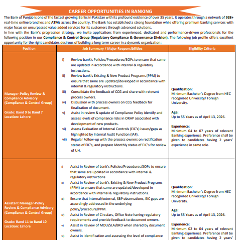 - Visit the Bank of Punjab Careers Portal