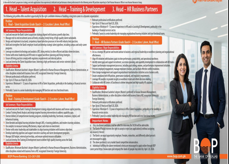 Head of Training & Development Job Lahore – The Bank of Punjab (BOP) – Band 4–2 L&D Leadership – Apply Before 20 April 2026