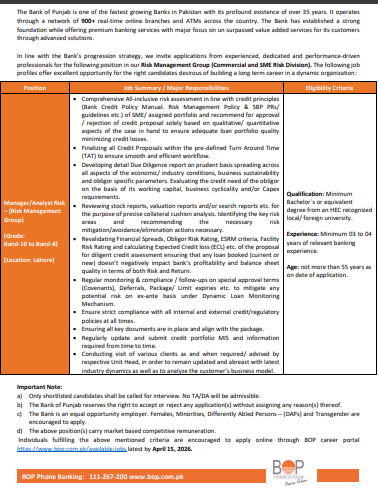 Manager Analyst Risk Jobs 2026 at Bank of Punjab BOP Latest Jobs in Pakistan