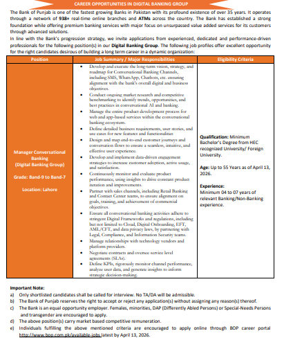 Manager Conversational Banking Jobs 2026 at Bank of Punjab BOP Lahore Apply Online Latest Jobs in Pakistan