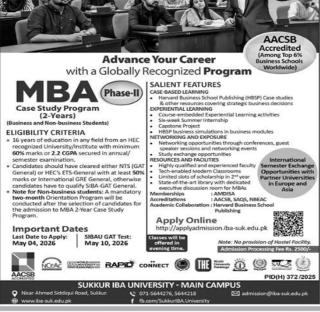 Sukkur IBA University MBA Admission 2026 Phase II is now open for applications in Sukkur.