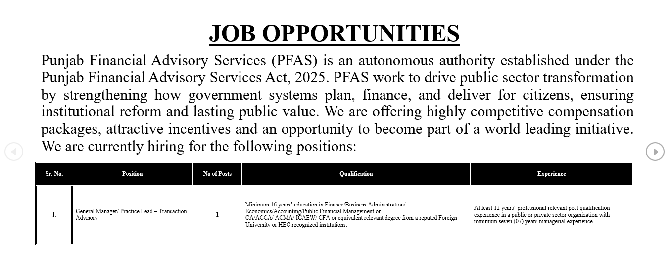 Punjab Financial Advisory Services (PFAS) is an autonomous authority established under the Punjab Financial Advisory Services Act 2025. PFAS Jobs 2026