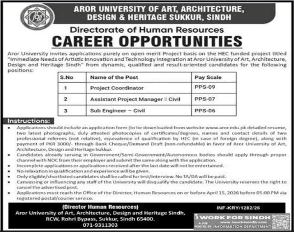 Project Coordinator Jobs 2026 Aror University Sukkur PPS-09 HEC Project Apply Now