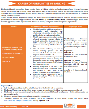 Relationship Manager SME Jobs 2026 at Bank of Punjab BOP Sialkot Apply Online Latest Jobs in Pakistan