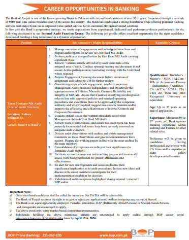 Team Manager MS Audit Internal Audit Jobs 2026 at The Bank of Punjab Lahore Apply Online