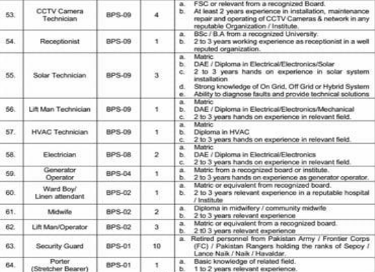 (All require relevant BS / Diploma / FSC with 1–3 years experience depending on post.)